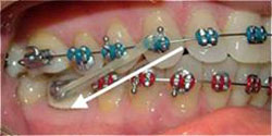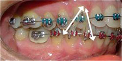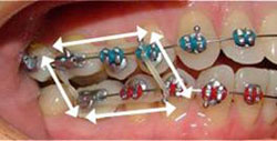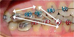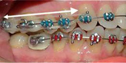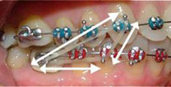 Closes spaces between teeth. Run elastic from upper 1st or 2nd molar hook to the upper cuspid hook. This elastic can be worn on lower arch also.